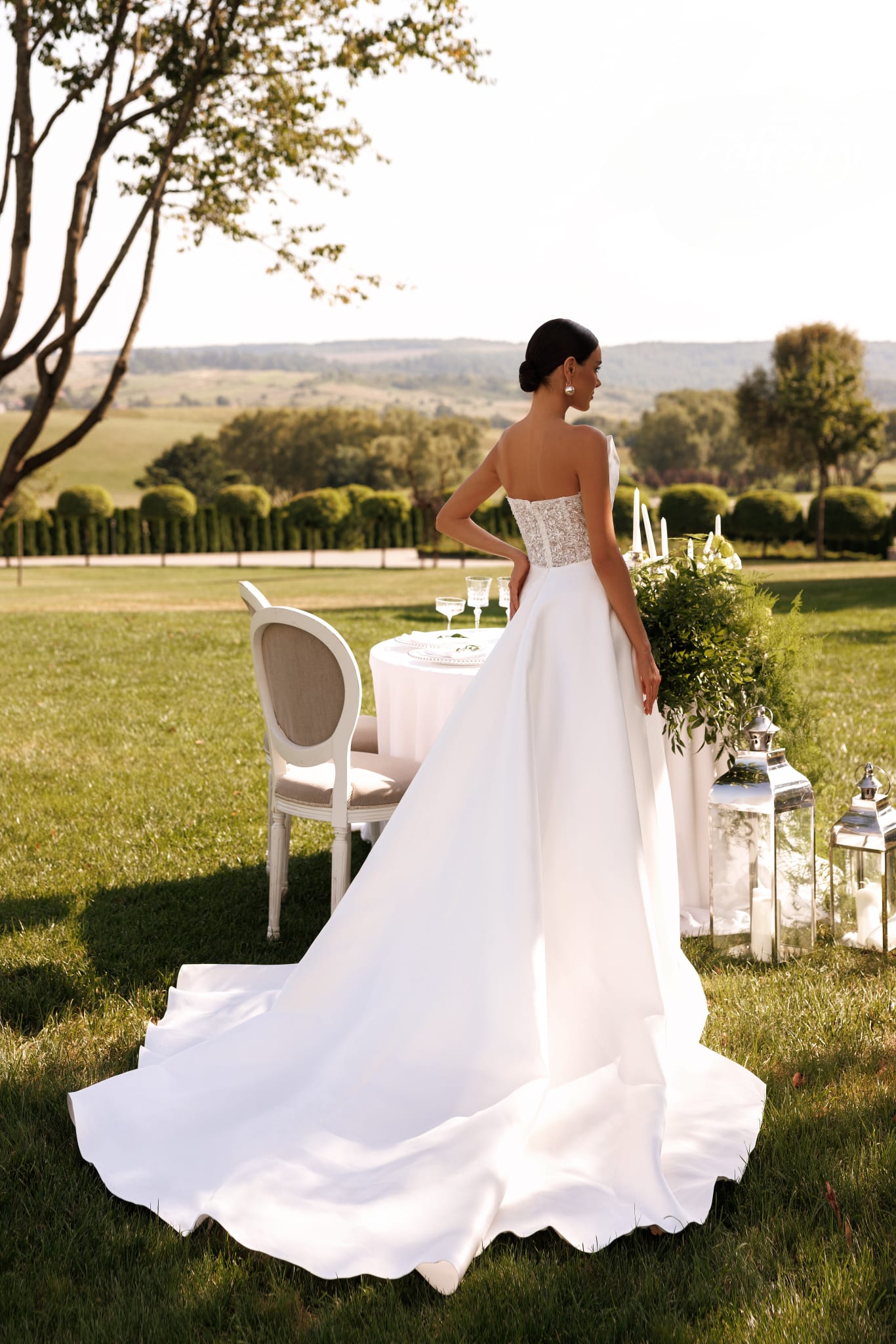 Su falda amplia y fluida crea una silueta majestuosa, perfecta para una novia segura, sofisticada y con un estilo atemporal.