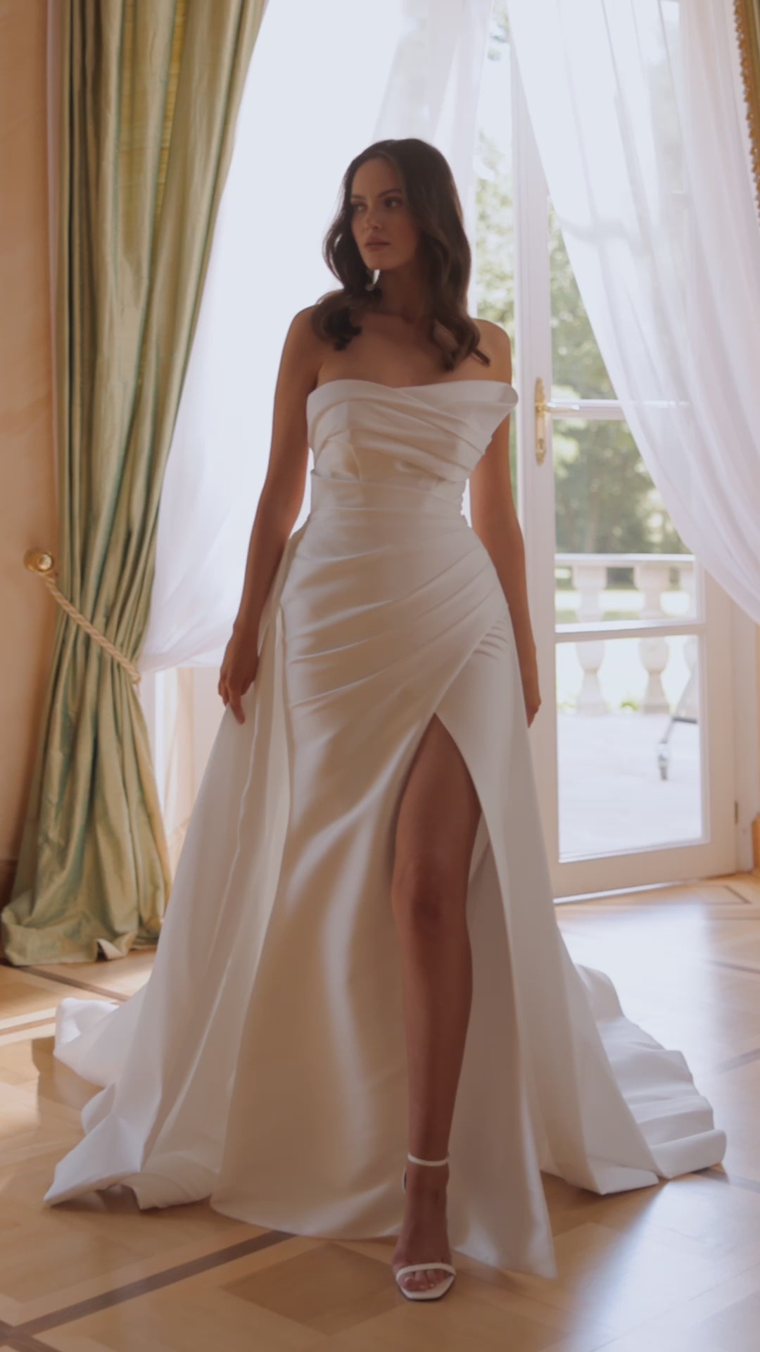 El diseño Atenea es un espectacular traje de novia de dos piezas que destaca por su palabra de honor con un drapeado artístico, envolviendo la silueta con una sofisticación radiante. El corte recto con abertura lateral estiliza la figura y aporta un movimiento sensual y seguro, ideal para una novia moderna y con carácter.