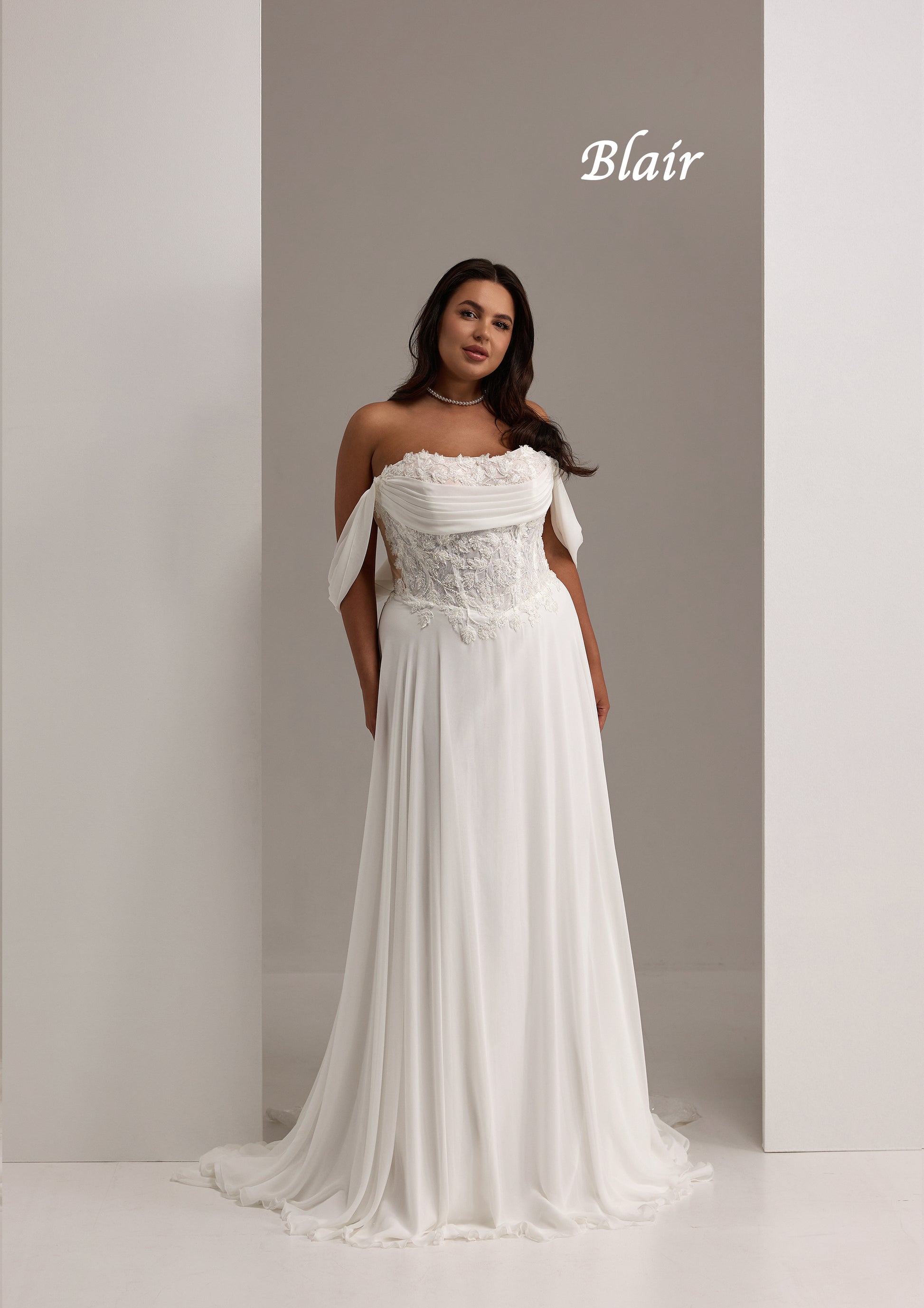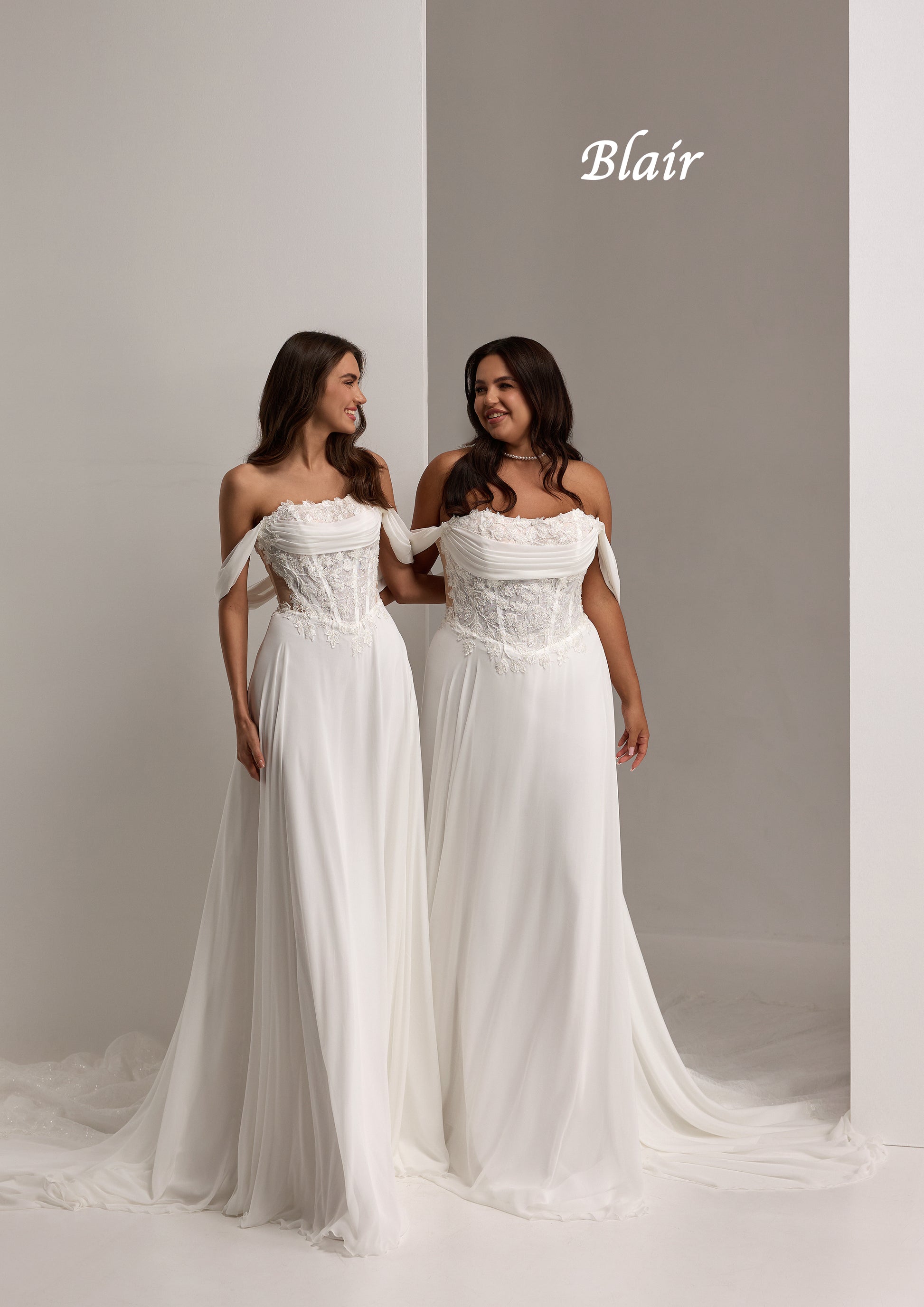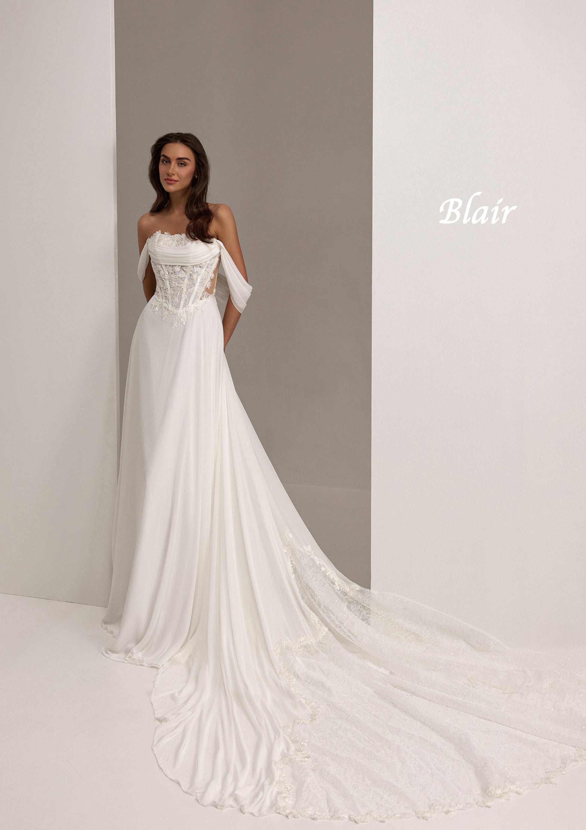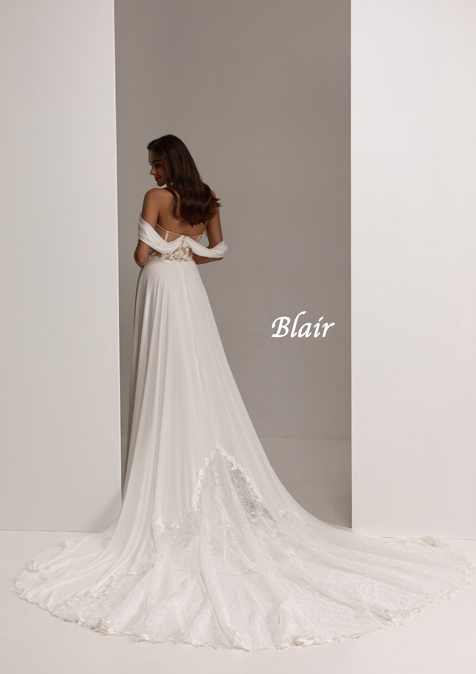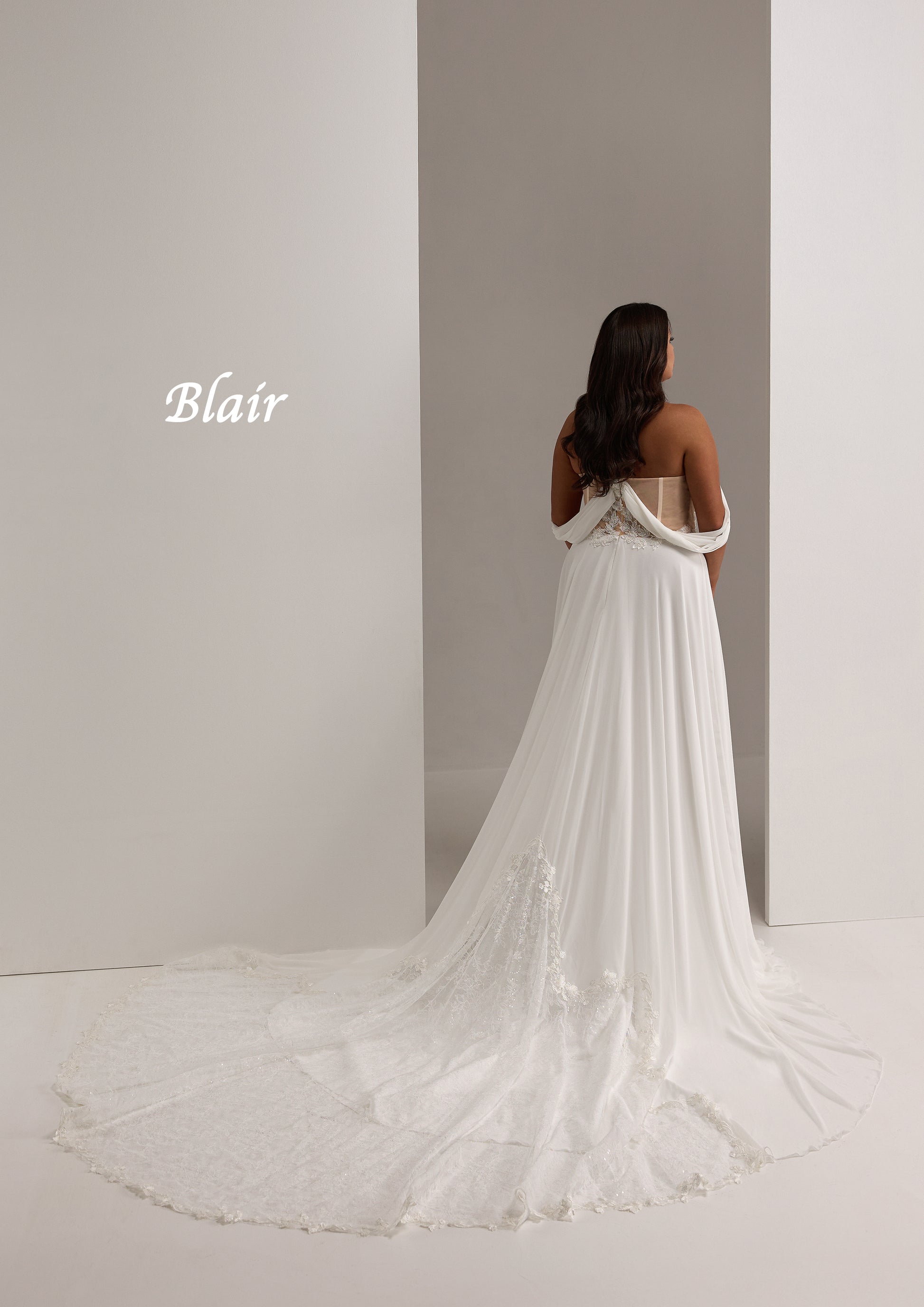 El diseño Blair es una oda a la elegancia etérea. Confeccionado en una exquisita gasa que cae con suavidad, este vestido de línea A realza la silueta con una delicada fluidez.