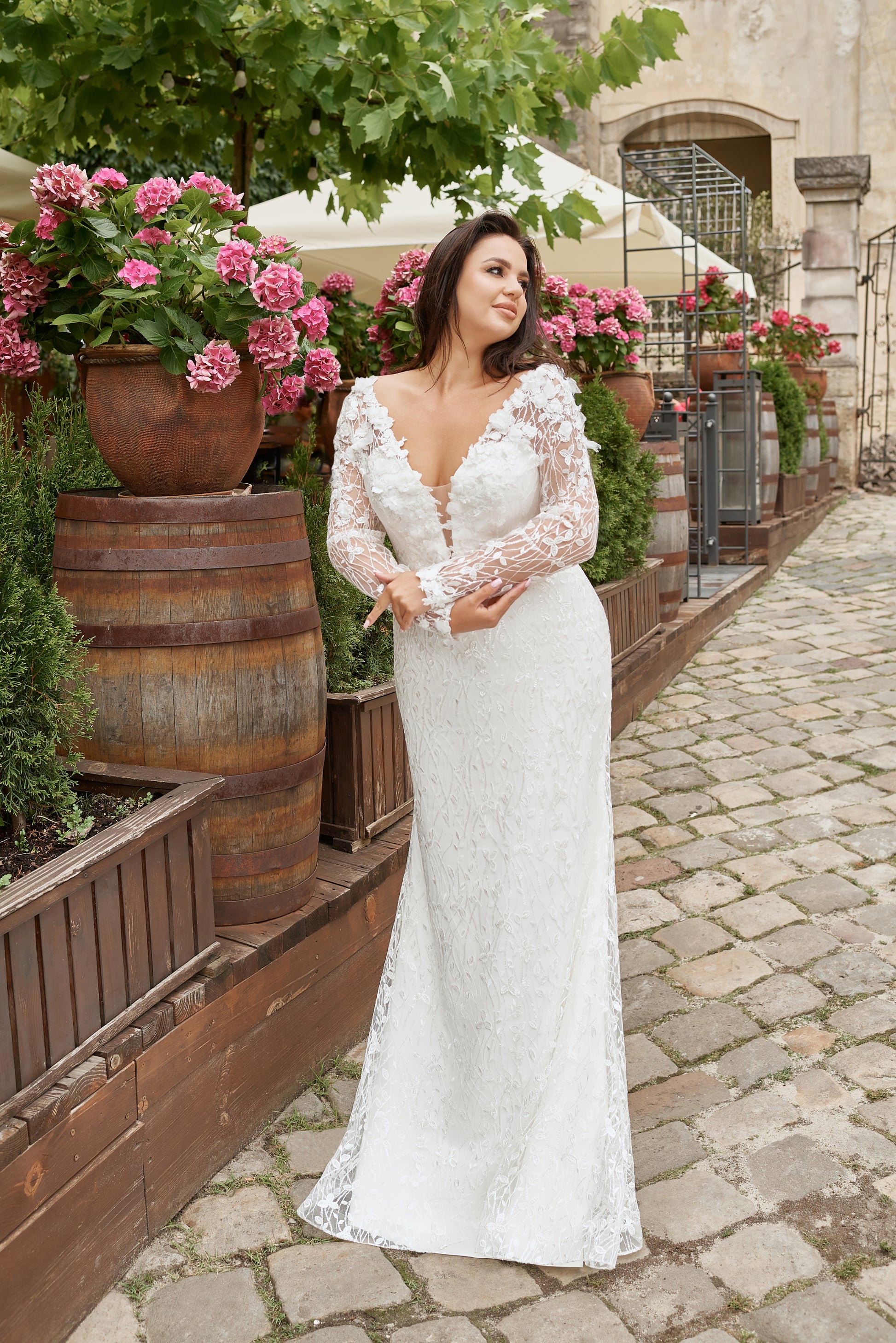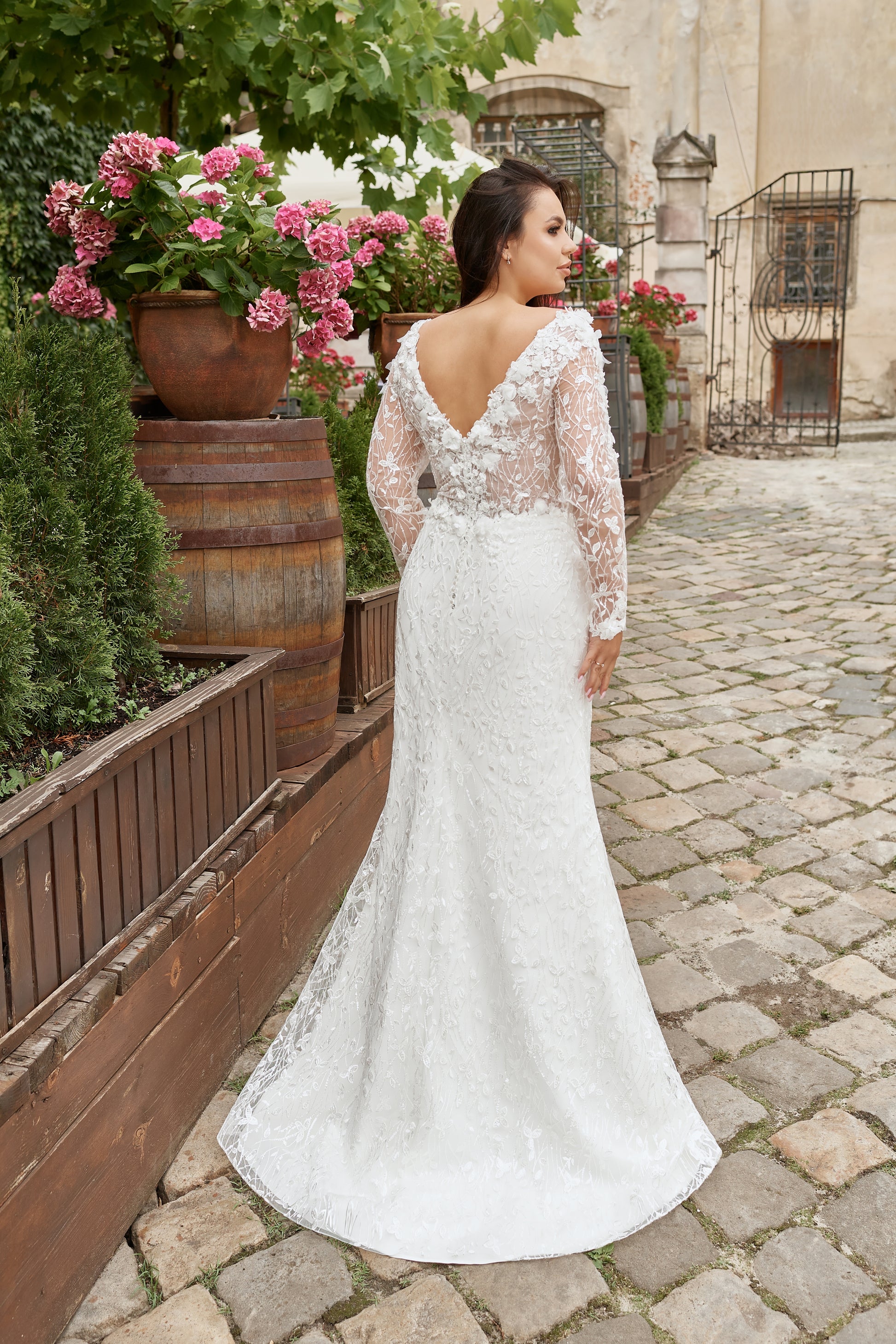Confeccionado íntegramente en encaje bordado, este diseño destaca por su elegancia atemporal.