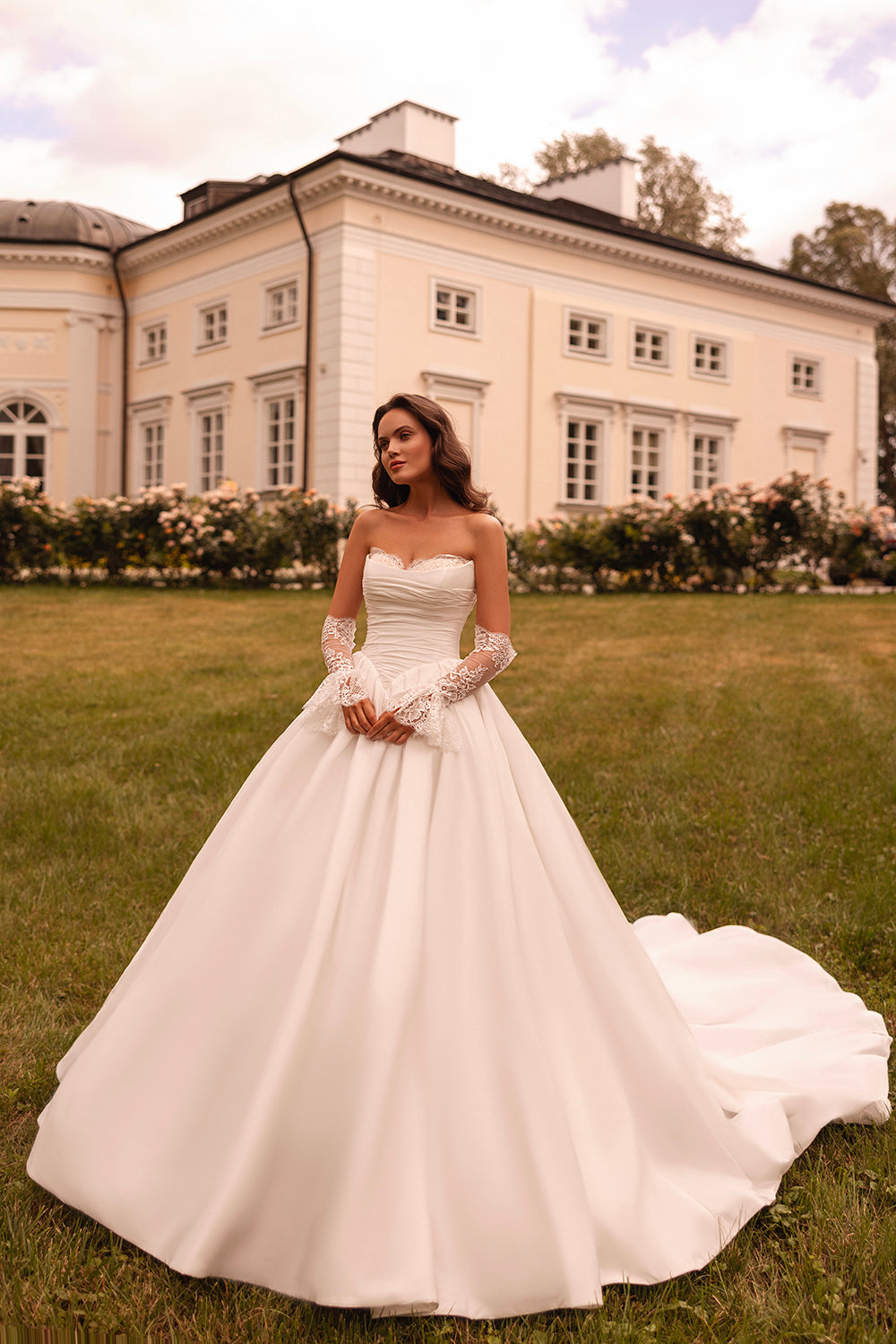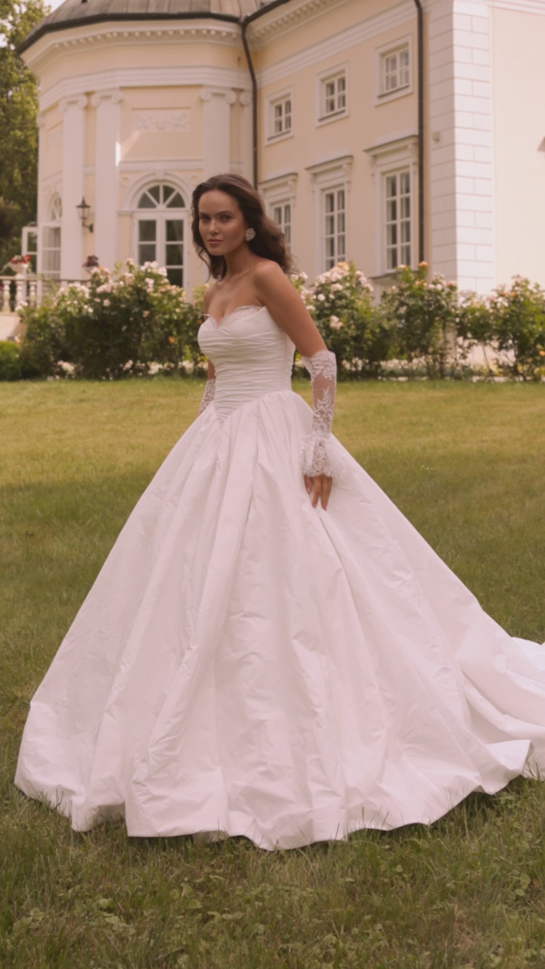 El modelo Regina es un espectacular vestido de corte princesa, con un cuerpo corset y escote en pico que estiliza la figura con elegancia y un drapeado sutil que realza la cintura con armonía y feminidad.