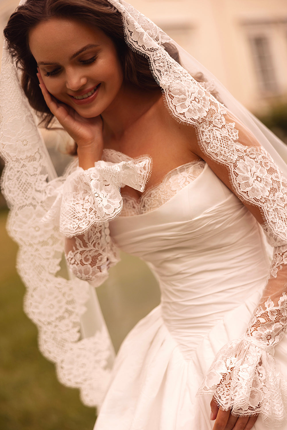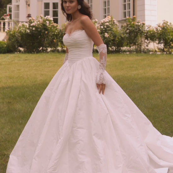Las mangas desmontables de encaje añaden romanticismo y versatilidad, permitiendo lucir dos estilos en un mismo gran día.