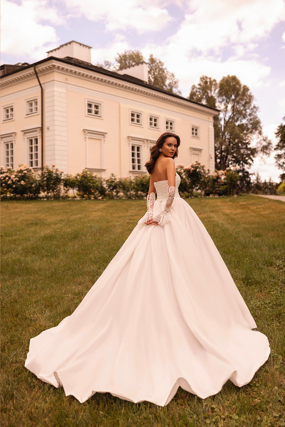 Su falda amplia y estructurada aporta movimiento sublime y una presencia majestuosa, rematada con una cola de hasta 3 metros incluida, ideal para una entrada triunfal que no pasará desapercibida.